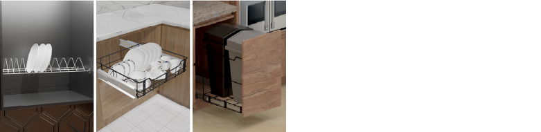 En la cocina, estos herrajes clásicos hacen toda la diferencia. Las canastas extraíbles, plateros y vajilleros se deslizan con cierre lento, evitando golpes y brindándote esa suavidad que hace tu día mucho más cómodo. Cada movimiento se siente natural y sin esfuerzo.