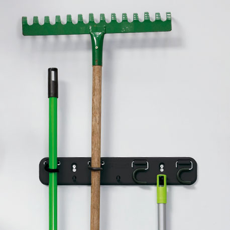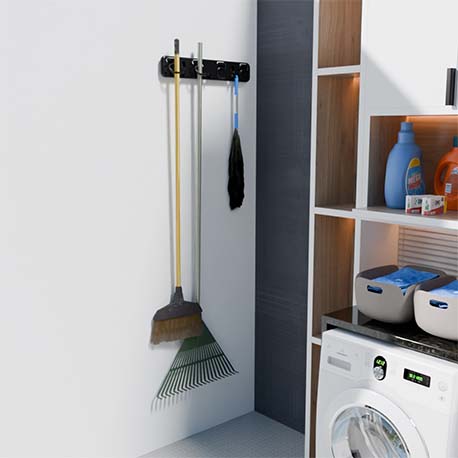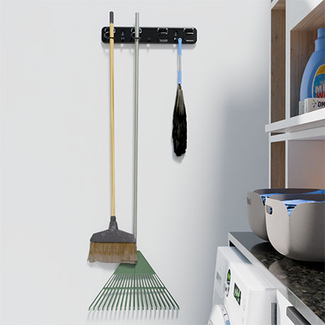 El Porta escobas plástico de Rejiplas, organiza tus elementos de limpieza de forma eficiente y sin ocupar mucho espacio. Incluye 4 ganchos para escobas y traperas, además de 3 ganchos pequeños en plástico inyectado ideales para limpiones, cepillos y más. Aprovéchalo en espacios verticales.